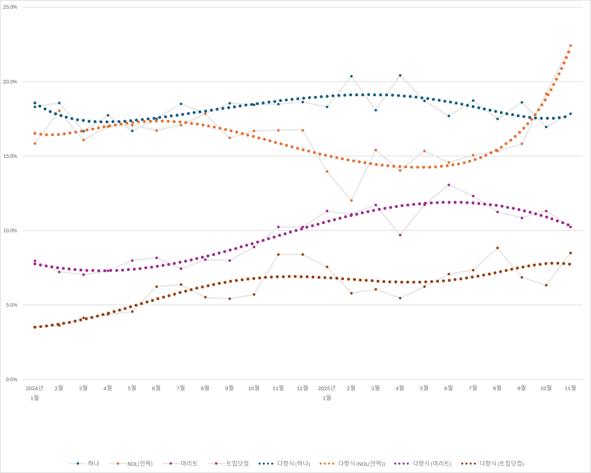 11월 실적에서 나란히 5%대 MS를 기록한 노랑풍선과 모두투어는 2024년도에는 평균적으로 7%대를 보였던 것을 생각하면 너무나 큰폭의 하락입니다.