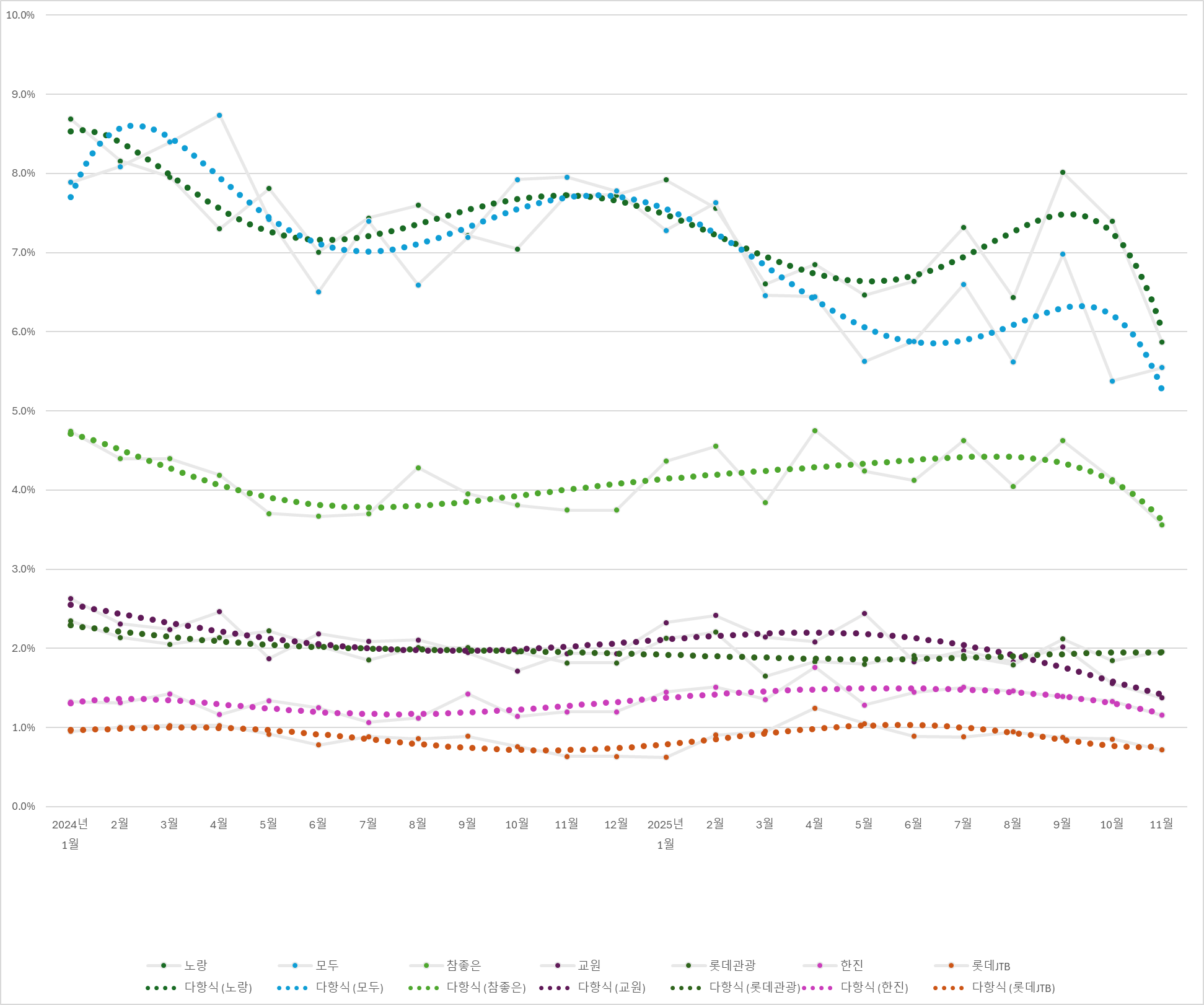 롯데관광을 제외한 모든 패키지 중심 여행사들의 실적은 하락세입니다. 노랑과 모두의 실적 하락은 이래도 될까 싶은 상황, 참좋은도 연휴 이슈가 사라지고 나니 이렇게 크게 떨어지고 있구나 라고 생각되지만, 그래도 교원투어의 실적하락은 꽤 눈에 띄는 상황입니다. 하락세는 더욱 커지고 있고 한진관광과의 격차도 얼마 남지 않았습니다.