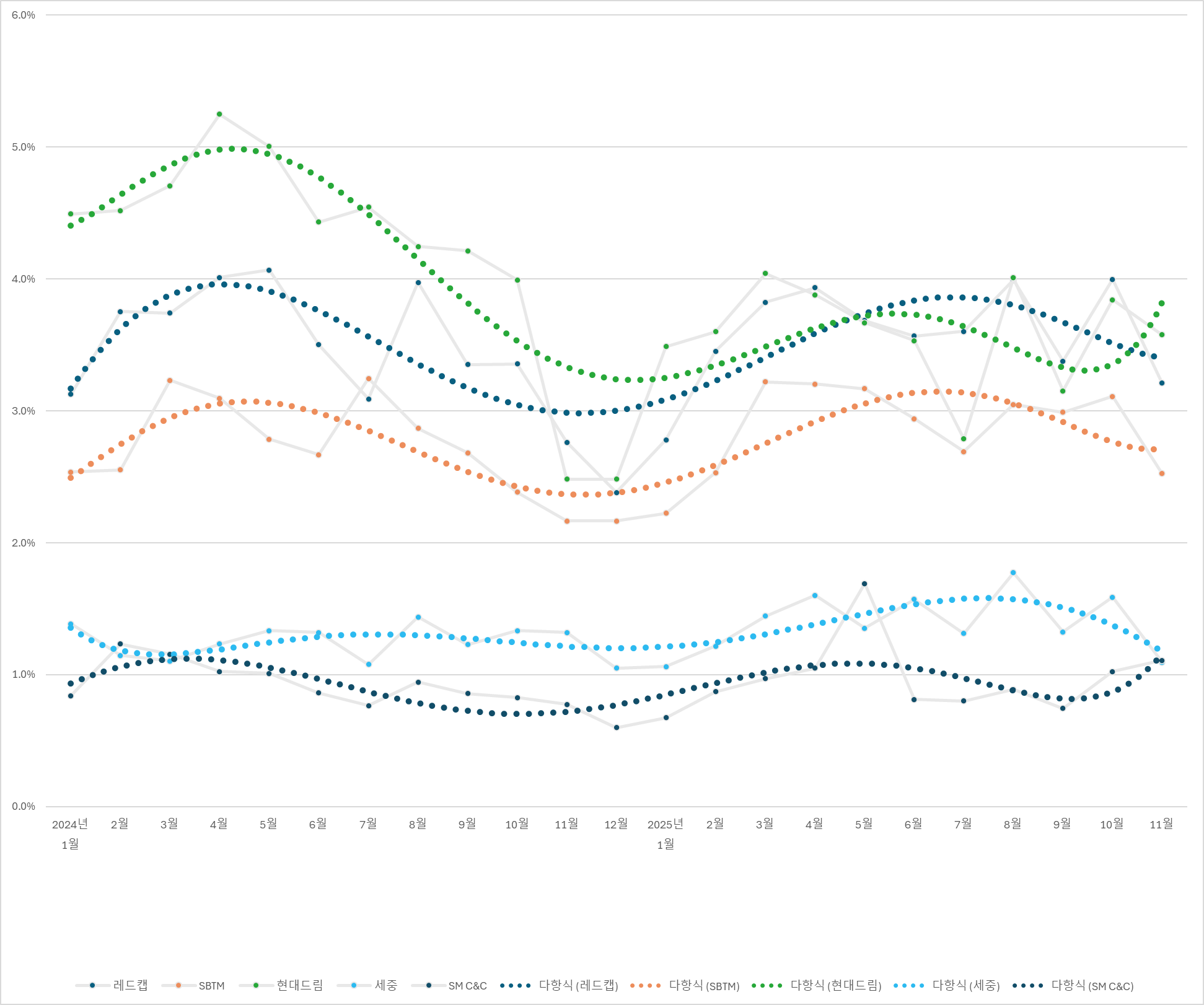11월 출장 여행사들의 실적은 거의 변동이 없어 보입니다. 크지는 않지만 세중의 하락 정도가 보이고 다시 레드캡을 앞선 현대드림투어의 실적이 보입니다. 역시 출장 여행사들은 안정적인 실적이 가장 큰 장점입니다.